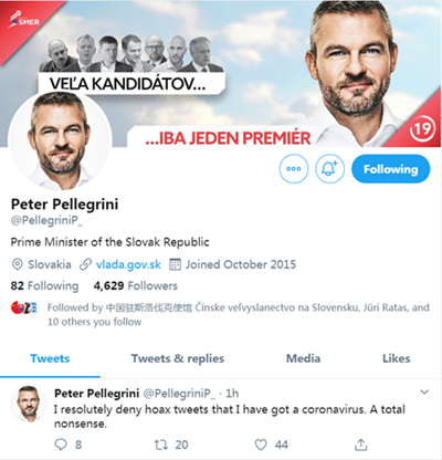 2月下旬,斯洛伐克總理佩萊格里尼闢謠説自己沒有感染新冠狀病毒肺炎