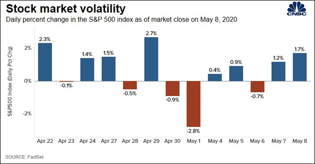 “股票市場易變性”,截至5月8日收盤,道指、標普500指數每日變化百分比 CNBC報道截圖