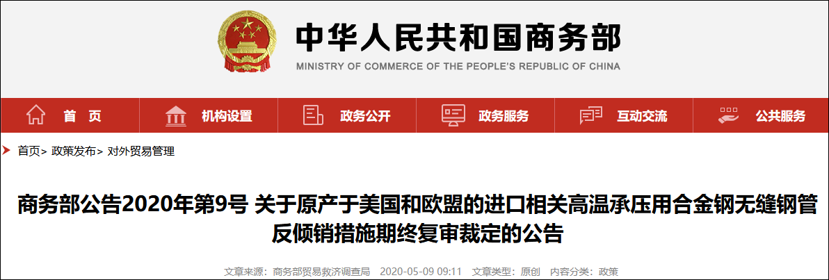 商務部網站5月9日發佈2020年第9號公告,宣佈自2020年5月10日起,對原產於美國和歐盟的進口相關高温承壓用合金鋼無縫鋼管繼續徵收反傾銷税,實施期限為5年。