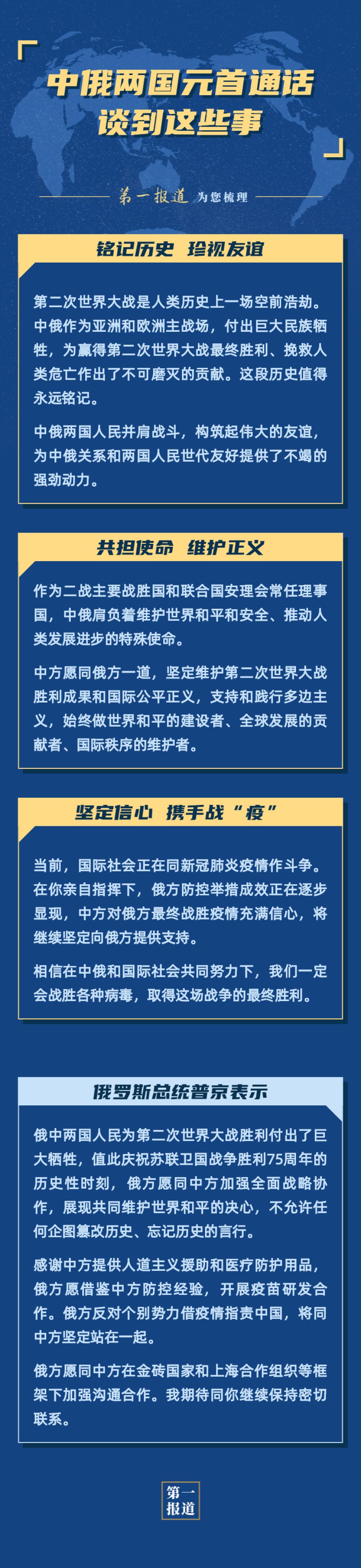 普京表示,俄中兩國人民為第二次世界大戰勝利付出了巨大犧牲,值此慶祝蘇聯衞國戰爭勝利75週年的歷史性時刻,俄方願同中方加強全面戰略協作,展現共同維護世界和平的決心,不允許任何企圖篡改歷史、忘記歷史的言行。感謝中方提供人道主義援助和醫療防護用品,俄方願借鑑中方防控經驗,開展疫苗研發合作。俄方反對個別勢力借疫情指責中國,將同中方堅定站在一起。俄方願同中方在金磚國家和上海合作組織等框架下加強溝通合作。我期待同你繼續保持密切聯繫。