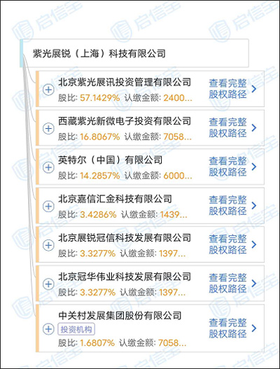 紫光展鋭融資原股東名單 圖片來源:啓信寶