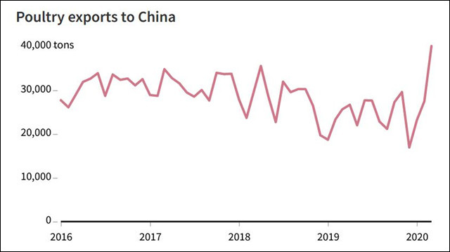 除了豬肉以外,美國家禽肉出口量也在增加。美國雞肉供應商“朝聖者的自豪”(Pilgrim’s Pride)首席執行官傑森·潘(Jayson Penn)在電話會議上對分析師表示,該公司出口總額在第一季度增長了24%,其中賣到中國的銷售額約佔20%。