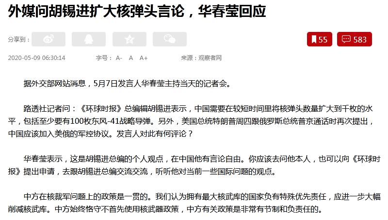 有説法認為胡錫進在暗示中國已經有1000枚核彈了,也有人認為胡錫進只是在為中國增加核彈造聲勢。不管是哪一種情況,正如華春瑩在回答外媒記者詢問中指出的,中國有言論自由,胡錫進到底是什麼意思,應該問他去。
