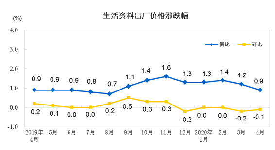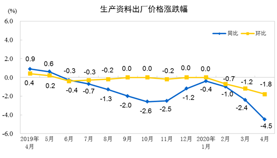國家統計局5月12日公佈工業生產者出廠價格指數(PPI)數據顯示,2020年4月份,全國工業生產者出廠價格同比下降3.1%,環比下降1.3%;工業生產者購進價格同比下降3.8%,環比下降2.3%。1—4月平均,工業生產者出廠價格比去年同期下降1.2%,工業生產者購進價格下降1.5%。