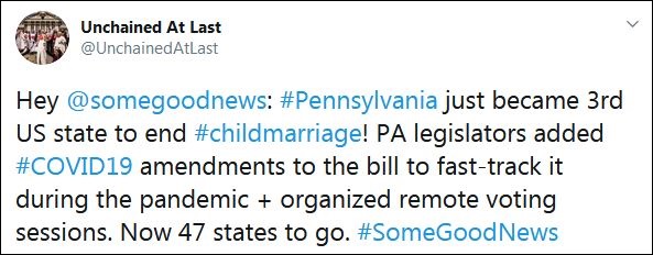 常年致力於廢除美國童婚和強迫婚姻的社會服務組織“Unchained”也在推特上對此表達了慶祝,但他們同時提醒稱,美國還有47個州需要廢除童婚。