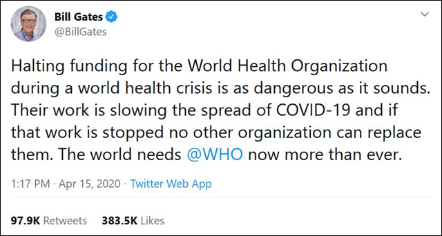 而在特朗普宣佈停止資助世衞組織後,蓋茨在推特上發文支持世衞組織:“世界現在比以往任何時候都需要世衞組織。”