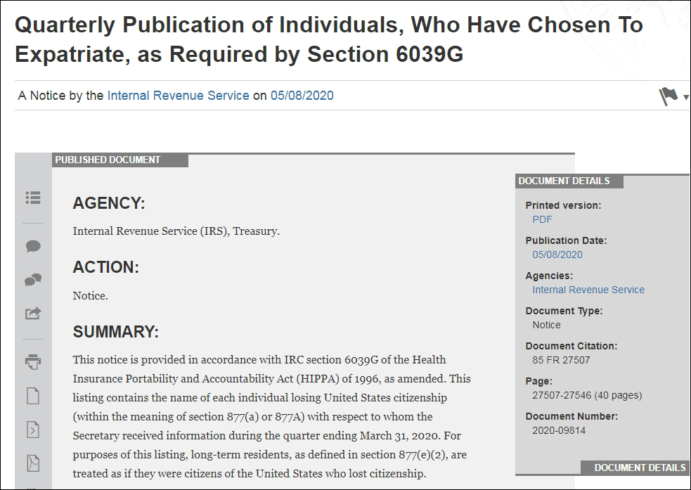 美國國税局每三個月會公佈一份放棄美國公民身份的名單。5月8日的數據顯示,今年1月至3月的名單共有2909人,較去年第四季度的261人增長了11倍以上。