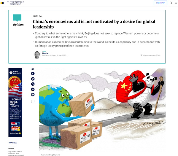 《南華早報》5月13日刊登周波文章《中國的抗疫援助不是為了爭當全球霸主》