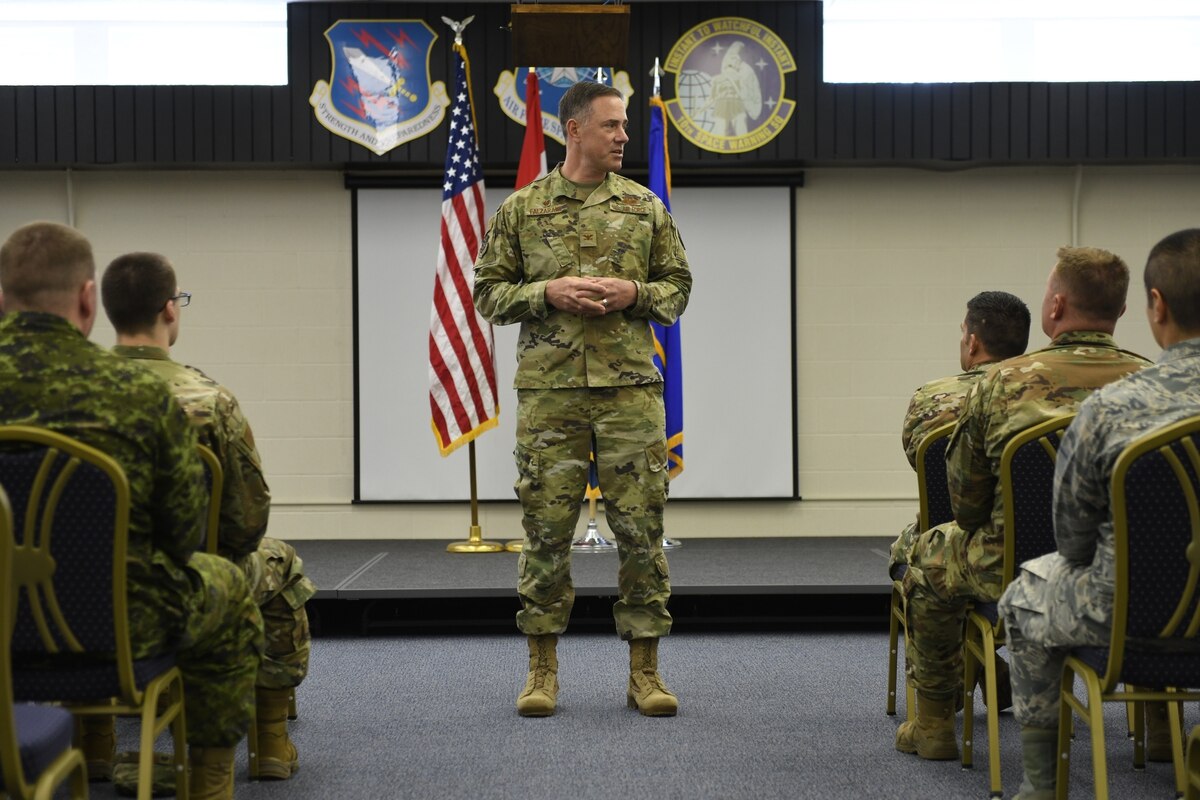 托馬斯·法爾扎拉諾上校(中),他背後左邊的劍盾標誌為第21太空聯隊隊徽 圖片來源:美國空軍