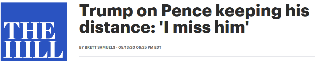 特朗普説,他與彭斯二人“在電話裏説了很多話”,並誇獎了彭斯的做法:“我在白宮,而彭斯在他的辦公室,離其他人很遠,他做得很好。”