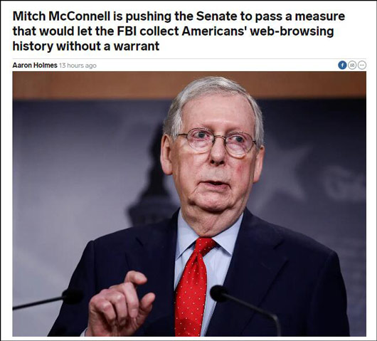 據美國《商業內幕》13日報道,參議院多數黨領袖米奇·麥康奈爾正在推動一項修正案,該法案將是有史以來第一次允許美國聯邦調查局(FBI)在沒有搜查令的情況下,獲取美國人的網頁瀏覽與歷史搜索記錄。