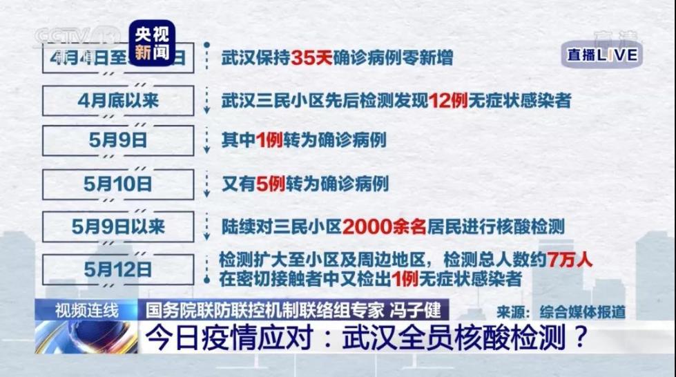 馮子健: 3 月 8 日,武漢實現確診病例零新增後,醫療機構一直在擴大核酸檢測的範圍。這段時間以來,每天都有呈陽性的檢測者,他們是無症狀感染者。近期,武漢又發生了一起聚集性疫情,這表明武漢前期的病毒傳播並沒有被完全阻斷。 武漢市採取全員核酸檢測的措施是積極的行動,對社會動員力度非常大。