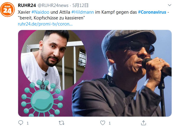 德國的一些公眾人物也成為“陰謀論”的有力推手:德國著名流行歌手沙維爾·奈杜(Xavier Naidoo)否認新冠病毒的存在,聲稱這是“憑空捏造”出來的瘟疫;德國土裔素食菜譜作者和電視烹飪明星希爾德曼(Attila Hildmann)公開指罵衞生部長施帕恩(Jens Spahn):“沒有人想要你骯髒的應用程序(Drecksapp)、沒有人想要你引入的蓋茨投資的疫苗接種義務(Zwangsimpfung),沒有人想要你計劃中的監控之國(Überwachungsstaat)”;多名德國天主教主教響應梵蒂岡前駐美大使維迦諾(Carlo Maria Vigano)發出的倡議,在一封聯名信中呼籲警惕“出現一個不受任何控制的世界政府”,質疑新冠病毒的傳染性和危害性,認為這是一些勢力在故意製造恐慌。