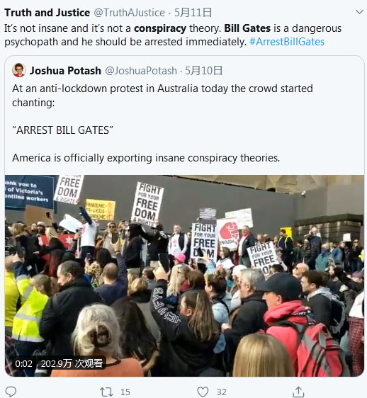 不只是德國,澳大利亞也有這樣的集會,而在推特上,各路“陰謀論”會互相串聯,捍衞本方觀點。圖片來源:推特截圖