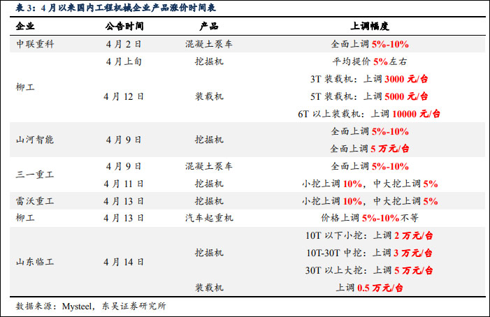 4月2日開始,三一重工、徐工機械、中聯重科、柳工等相繼宣佈,對挖掘機、泵車、起重機等設備進行5%-10%不等的價格上調,原因包括生產成本上升、國內基建需求迅速回升、產品供不應求等。