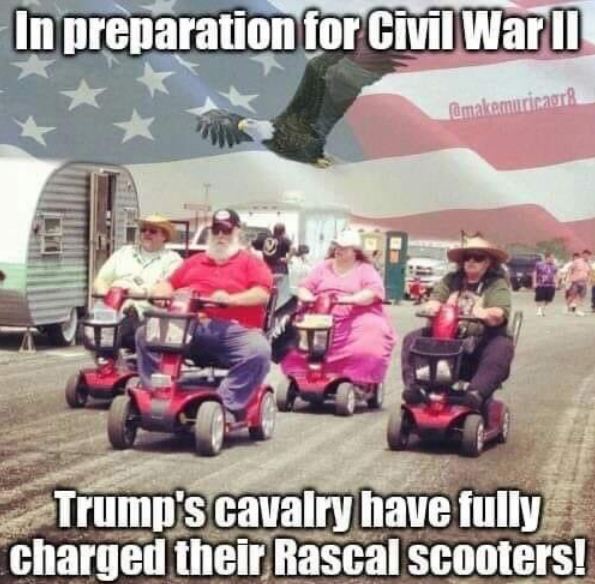 “為第二次內戰做準備。特朗普的騎兵已經給他們的流氓摩托車充好了電。”