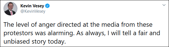 一位來自“News 12 Long Island”的記者凱文·維西(Kevin Vesey)在抗議現場採訪時,就拍下了一段視頻併發了推特:“這些抗議者對媒體的憤怒程度令人震驚,和往常一樣,我今天會客觀公正地報道。”