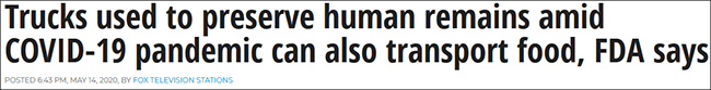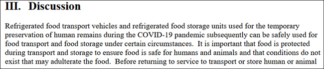 美國食藥監局在這份指導文件中表示,“在疫情期間臨時保存屍體的冷藏食品運輸車和冷藏食品設備,在特定條件下可以安全用於食品運輸和儲存。”