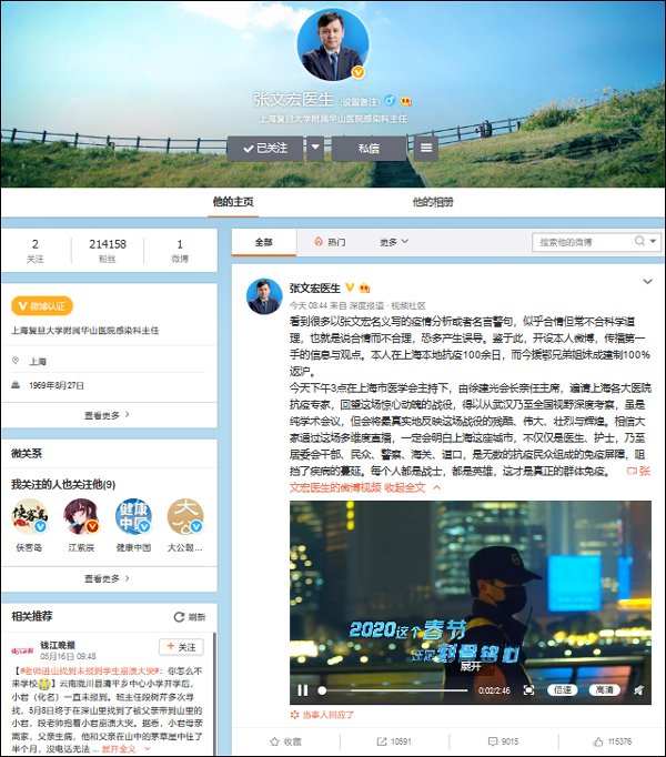 張文宏發佈首條微博,兩小時後粉絲數破21萬