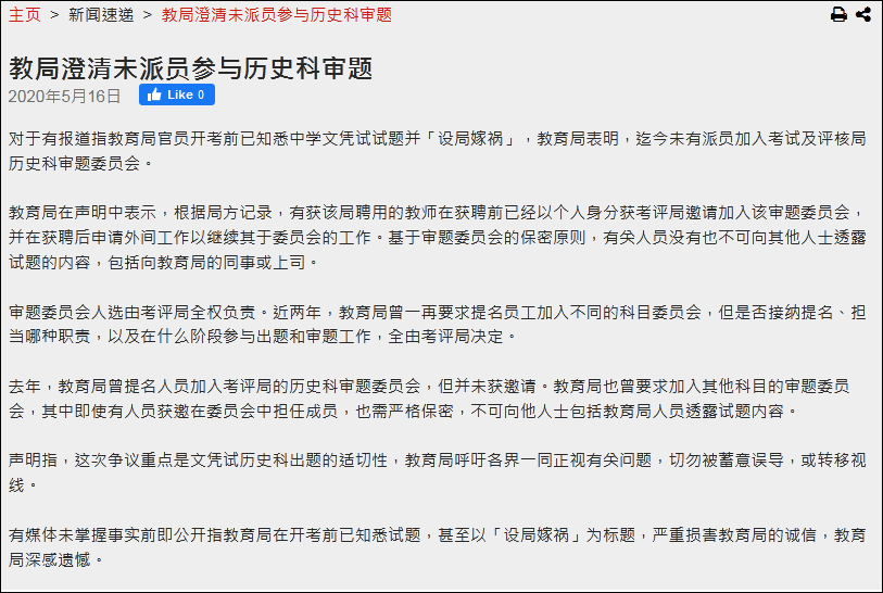 香港教育局澄清:未派員參與中學文憑試歷史科審題