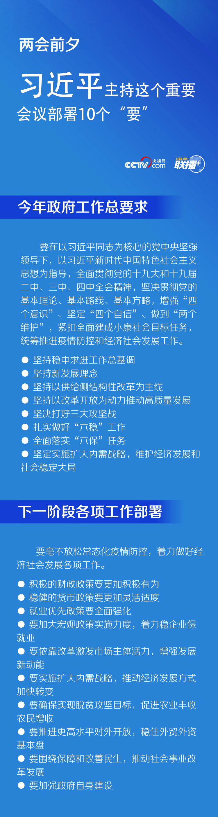 會議強調,當前全球疫情和世界經濟形勢仍然嚴峻複雜,我國發展面臨的挑戰前所未有。做好今年政府工作,要在以習近平同志為核心的黨中央堅強領導下,以習近平新時代中國特色社會主義思想為指導,全面貫徹黨的十九大和十九屆二中、三中、四中全會精神,堅決貫徹黨的基本理論、基本路線、基本方略,增強“四個意識”、堅定“四個自信”、做到“兩個維護”,緊扣全面建成小康社會目標任務,統籌推進疫情防控和經濟社會發展工作,在常態化疫情防控前提下,堅持穩中求進工作總基調,堅持新發展理念,堅持以供給側結構性改革為主線,堅持以改革開放為動力推動高質量發展,堅決打好三大攻堅戰,紮實做好“六穩”工作,全面落實“六保”任務,堅定實施擴大內需戰略,維護經濟發展和社會穩定大局,確保完成決戰決勝脱貧攻堅目標任務,全面建成小康社會。