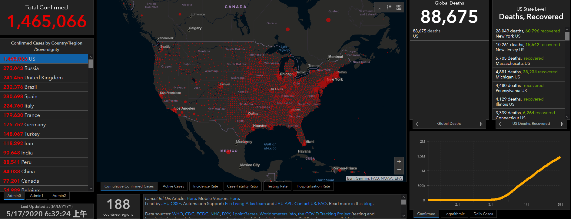 (觀察者網訊)據美國約翰斯·霍普金斯大學發佈的全球新冠肺炎數據實時統計系統,截至美國東部時間5月16日晚6時32分(北京時間17日6時32分),全美共報告新冠肺炎確診1465066例,死亡88675例。過去24小時,美國新增確診23894例,新增死亡1248例。