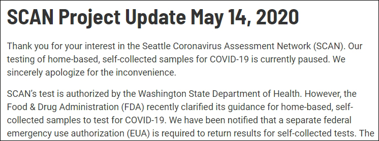 聲明提到,該項目此前獲得華盛頓州衞生部的“緊急使用許可”(EUA)。但自5月8日起,FDA要求各州批准獨立新冠病毒檢測項目時,必須在聯邦層面獲得一份單獨的“緊急使用許可”審批。