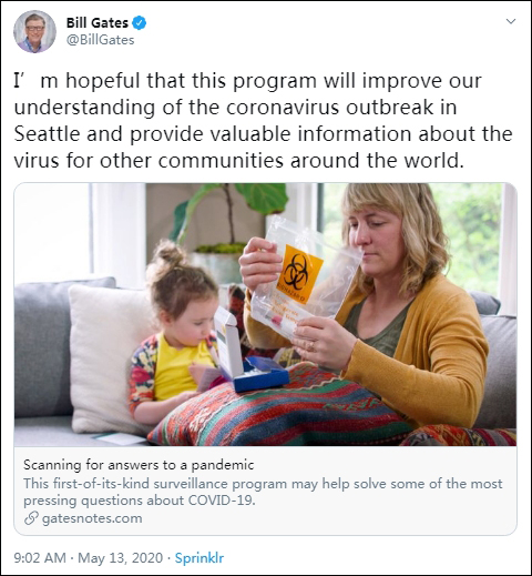 綜合“今日俄羅斯”、“數字趨勢”網站,蓋茨12日在個人博客上宣佈,他的基金會將資助由華盛頓大學主導的“西雅圖新冠病毒評估網絡”(SCAN)項目。該項目向西雅圖居民發放免費的自助檢測試劑盒。使用者可以在家自行提取鼻拭子,然後提交到當地的5個醫療機構。