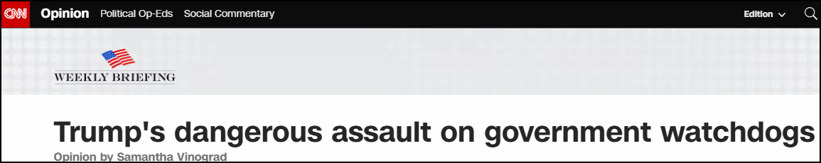 CNN援引美國《1987年監察長法案》稱,監察長的職責為獨立、客觀地監督政府是否有鋪張浪費、欺詐與職權濫用的行為。CNN表示,履行監察長職責的人被特朗普撤職或者禁言只會讓聯邦政府日趨政治化,並滋生一批屈從於權利或對惡行睜一隻眼閉一隻眼的官員。