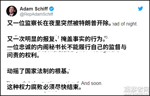 眾議院情報委員會主席亞當·希夫發推特表示不能容忍這樣的行為: