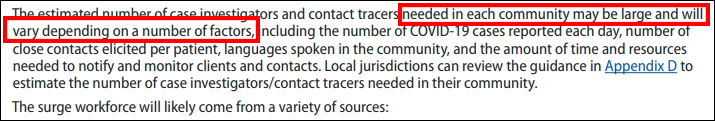 方案尤其強調,考慮一名患者可能有多名密接人員,應增加調查人員數量,形容這將會是一個“勞動力密集”的過程。但具體人數需求“視各地不同因素”而定,由各州自行評估。