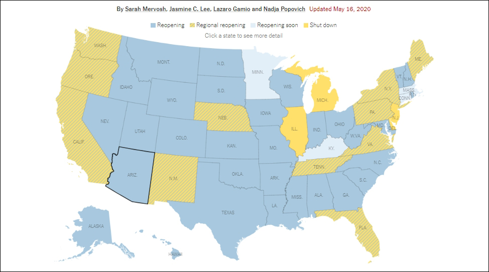 截至當地時間5月16日,全美共31個州(圖中深藍色)完全重開 統計:《紐約時報》