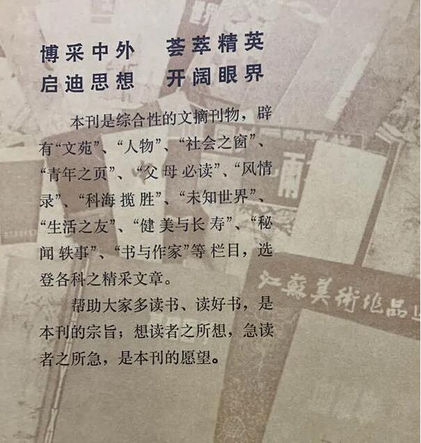 “潘曉”向全社會吐露心聲那年,甘肅人民出版社找到胡亞權和鄭元緒兩位編輯,希望他倆能夠合辦一本雜誌。胡、鄭都是熱愛文藝的理科生,研究了一通市面上的雜誌,決心辦一本文摘。想告訴我國讀者: