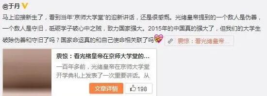 馬上就有人指出于丹講解上的硬傷,更有十位教授抱團抵制,説她曲解經典。於自己也不太爭氣,上網轉發“光緒迎新講話寄語”,結果被扒出來是網文,出自網絡小説《一個人的甲午》的“心中之賊”。