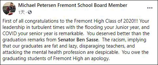事實上,弗裏蒙特高中是薩斯的母校,他於1990年從該校畢業,從業後還曾擔任米德蘭大學校長。當前,薩斯正在忙着準備2020年參議院競選連任,而他的同州競爭對手——民主黨人亞尼切克(Chris Janicek)也對他此次的演講發出指責。