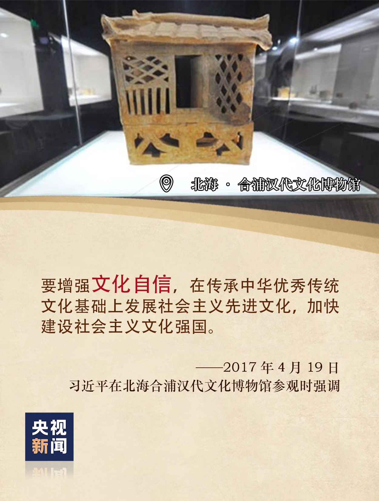 2017年4月19日,習近平到廣西北海考察時,首站便是合浦縣漢代文化博物館。習近平説:“要加強文物保護和利用,加強歷史研究和傳承,使中華優秀傳統文化不斷發揚光大。”