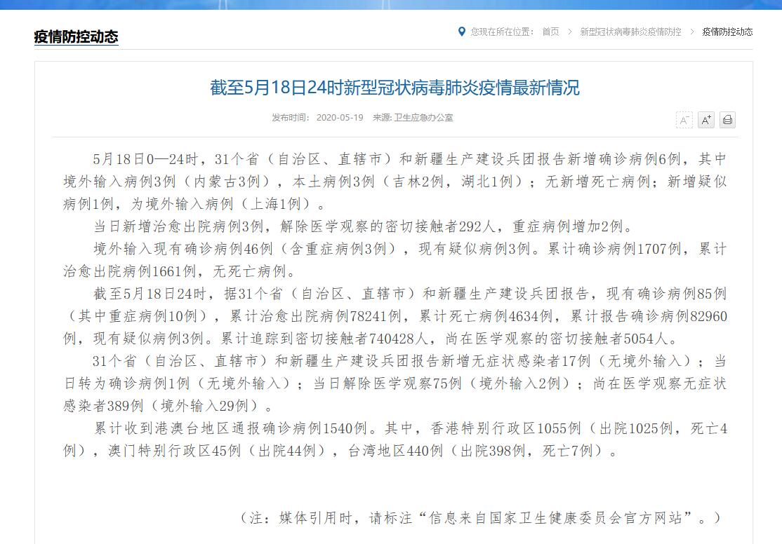 據國家衞生健康委5月19日通報,5月18日0—24時,31個省(自治區、直轄市)和新疆生產建設兵團報告新增確診病例6例,其中境外輸入病例3例(內蒙古3例),本土病例3例(吉林2例,湖北1例);無新增死亡病例;新增疑似病例1例,為境外輸入病例(上海1例)。