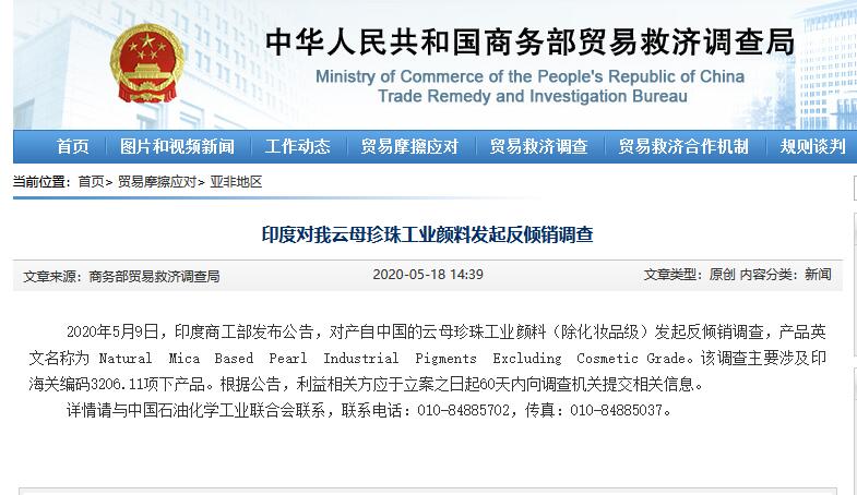 據商務部貿易救濟調查局網站5月18日消息,2020年5月9日,印度商工部發布公告,對產自中國的雲母珍珠工業顏料(除化妝品級)發起反傾銷調查,產品英文名稱為 Natural Mica Based Pearl Industrial Pigments Excluding Cosmetic Grade。該調查主要涉及印海關編碼3206.11項下產品。根據公告,利益相關方應於立案之日起60天內向調查機關提交相關信息。