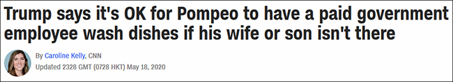 接着特朗普開始替蓬佩奧辯解:“我現在跟你講講關於這些個遛狗、洗盤子的事。我寧願讓他去跟某個國家領導人通電話,也不願讓他洗盤子,因為他的妻子和孩子可能不在身邊。”特朗普還表示,他在聽到這事時覺得“國家事務的優先級被搞亂了”。