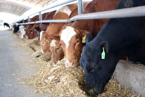 養殖場內,黃牛正津津有味地吃着草料。(陳立庚攝)