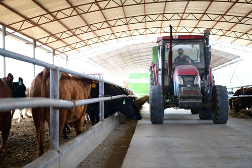 養殖場內,飼料攪拌車正給牛喂飼草。(陳立庚攝)