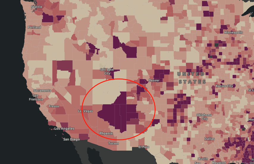該地區疫情嚴重(約翰斯·霍普金斯大學疫情熱力圖,依美國州縣界劃分)