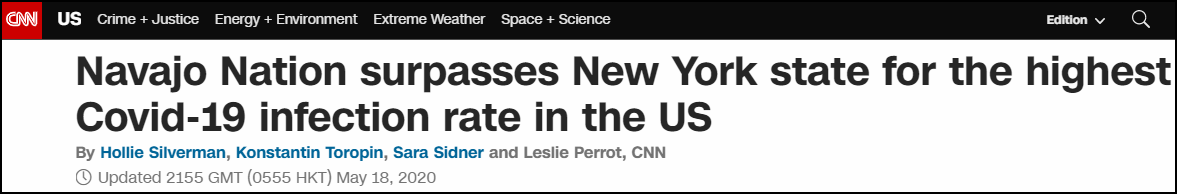 據CNN消息,2010年統計該地共有173667人口,目前,部落累計確診4002例;這片原住民的領地每10萬人就有2304.41人確診。而據約翰斯·霍普金斯大學統計,紐約州每10萬人確診人數為1806例,新澤西州為1668例。