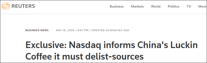 (觀察者網訊)19日晚間,據路透社報道稱,納斯達克交易所已經通知瑞幸咖啡必須摘牌。