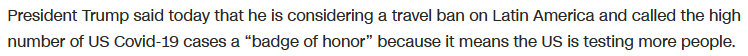 CNN剛剛報道,當地時間19日,美國總統特朗普表示,正在考慮對拉丁美洲尤其是巴西實施旅行禁令。目前,巴西累計確診病例數量已成為全球確診病例第三多的國家,僅次於美國及俄羅斯。