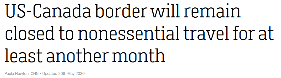 受新冠肺炎疫情影響,美加邊境於3月18日關閉。這是自4月18日雙方決定延長關閉30日後,第三次延長邊境關閉時間。