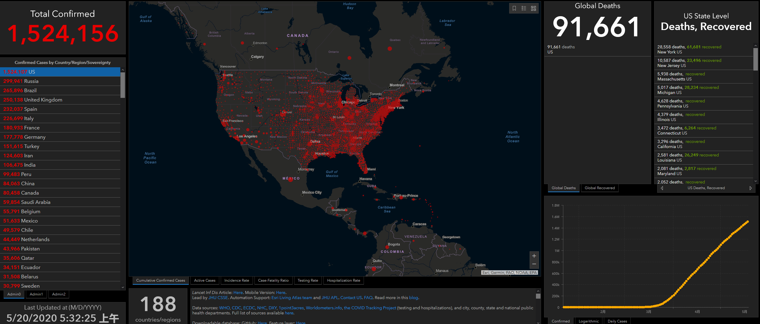 (觀察者網訊)據約翰斯·霍普金斯大學實時統計系統發佈的全球新冠肺炎數據,截至美東時間5月19日17時32分(北京時間20日5時32分),美國新冠肺炎確診病例為1524156例,死亡91661例。過去24小時,美國新增確診19770例,新增死亡1467例。