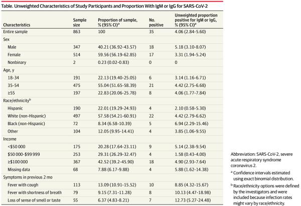 863名被測者中35名個體(4.06%;精確二項式CI,2.84%-5.60%)抗體測試陽性。陽性比例因種族/民族、性別和收入而異。測試結果為陽性的參與者的加權比例為4.31%。調整測試靈敏度和特異性後,SARS-CoV-2抗體的未加權和加權患病率分別為4.34%(Bootstrap CI,2.76%-6.07%)和4.65%(Bootstrap CI,2.52%-7.07%)。
