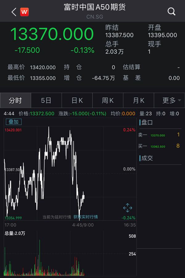 19日夜盤,富時A50指數期貨微跌。據Wind數據,富時A50指數期貨跌0.13%,收於13370.00點。