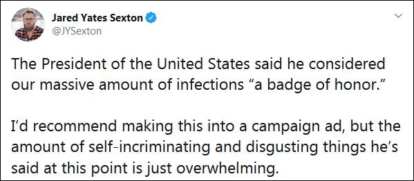 哈佛大學法學院教授勞倫斯·特里布在推特上諷刺稱:“這就像警察局讓一個連環殺手逍遙法外好幾個月,才將其間緝拿歸案,還把一連串屍體當做‘榮譽勳章’一樣。特朗普是個食屍鬼和白痴。”